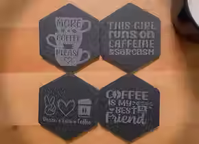 This handcrafted set of four hexagonal slate coasters is perfect for teachers, coworkers, or anyone who can’t start their day without coffee! Each coaster features a unique, laser-etched coffee quote — “More Coffee Please,” “This Girl Runs on Caffeine & Sarcasm,” “Peace • Love • Coffee,” and “Coffee is My Best Friend.” Made from natural black slate, these coasters add rustic charm while protecting surfaces from heat and moisture.