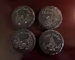Bring warmth and joy to your holiday gatherings with this set of four laser-etched slate coasters, each featuring a different festive design and greeting — “Merry Christmas,” “Seasons Greetings,” “Joy to the World,” and “Happy Holidays.”