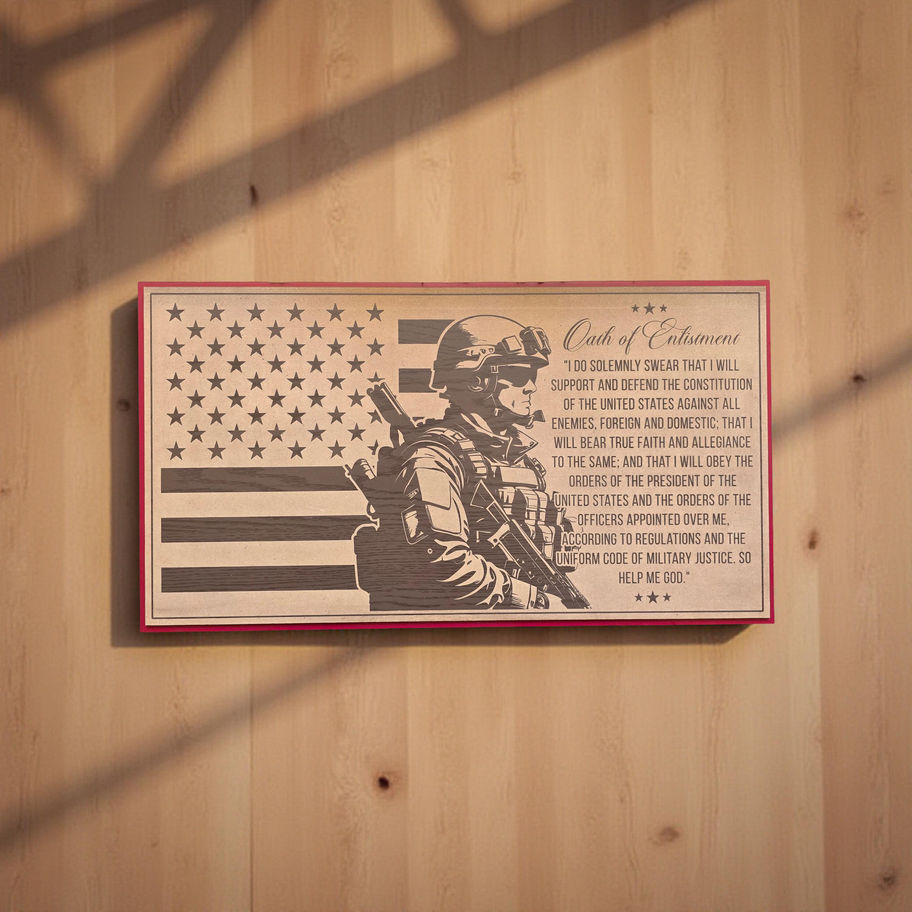 Honor the courage, duty, and sacrifice of those who serve with this intricately laser-cut and etched Oath of Enlistment plaque. Crafted from premium hardwood and precision-engraved with remarkable detail, this piece features a silhouette of a U.S. soldier standing proudly beside the American flag, accompanied by the full text of the Oath of Enlistment.